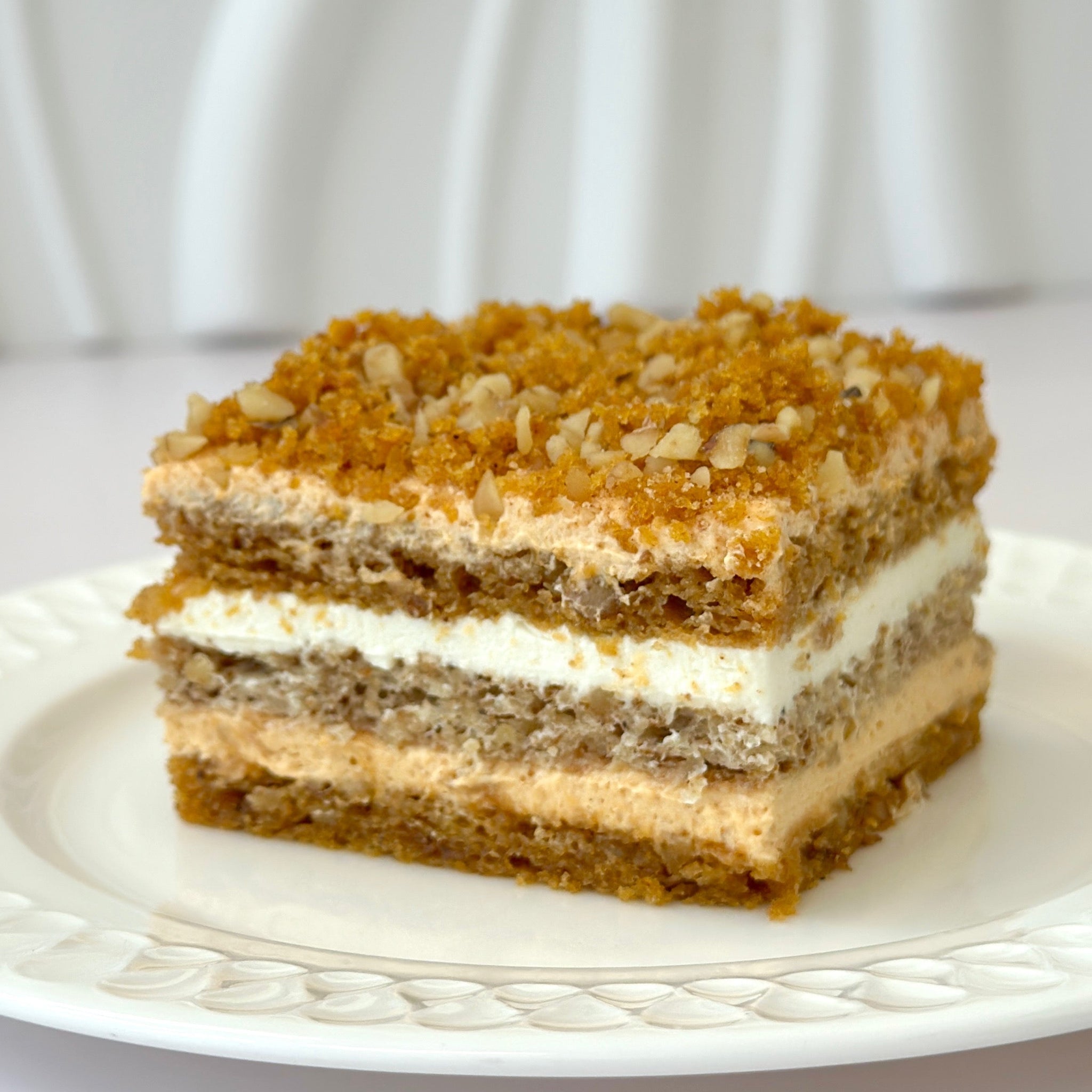 GLUTEN FREE.  Moist pumpkin sponge, layered with walnut dacquoise, creamy pumpkin mascarpone, and light amaretto flavored cream. Finished with spiced pumpkin crumbs and walnuts on top for a cozy, homemade touch.